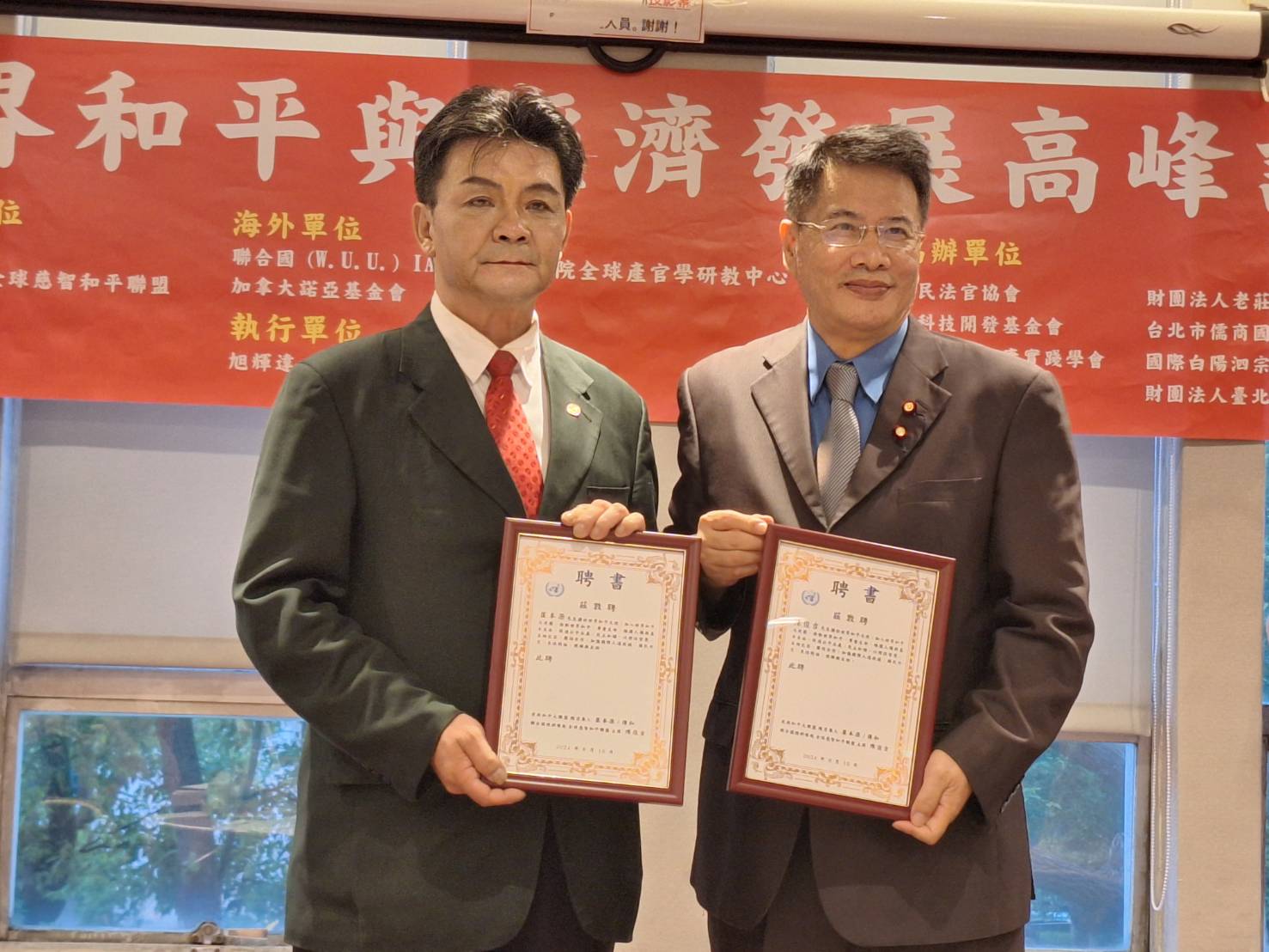 「愛與和平大聯盟」崔總召 與「聯合國總部緣起全球慈智和平聯盟」陳俊吉主席/IAE 校長(左)參與 共同主辦的一場《世界和平與經濟發展高峰論壇》